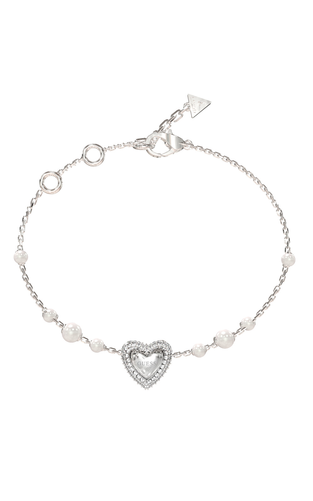 Γυναικείο βραχιόλι GUESS STEEL BELOVED JUBB06009JWRHL ασημένιου χρώματος με σχέδιο καρδιά με πέτρες, πέρλες και λογότυπο(21cm).