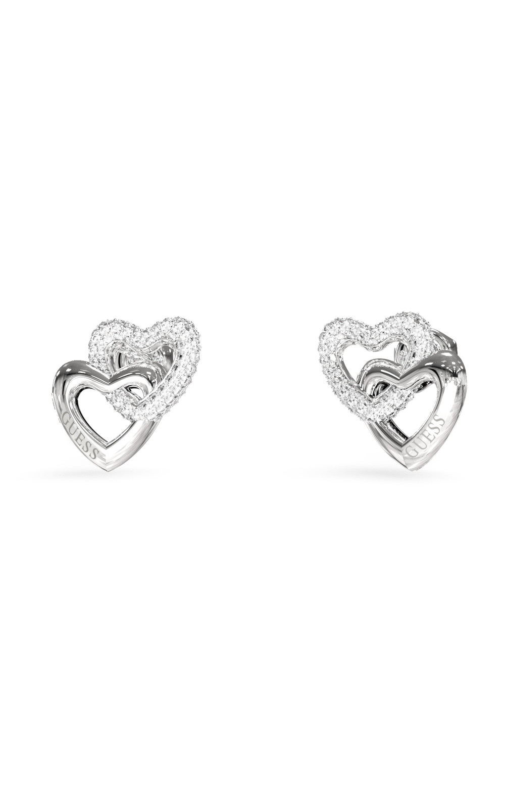 Γυναικεία σκουλαρίκια GUESS STEEL, ασημένια με σχέδιο καρδιές, πέτρες και λογότυπο(1,5cm).