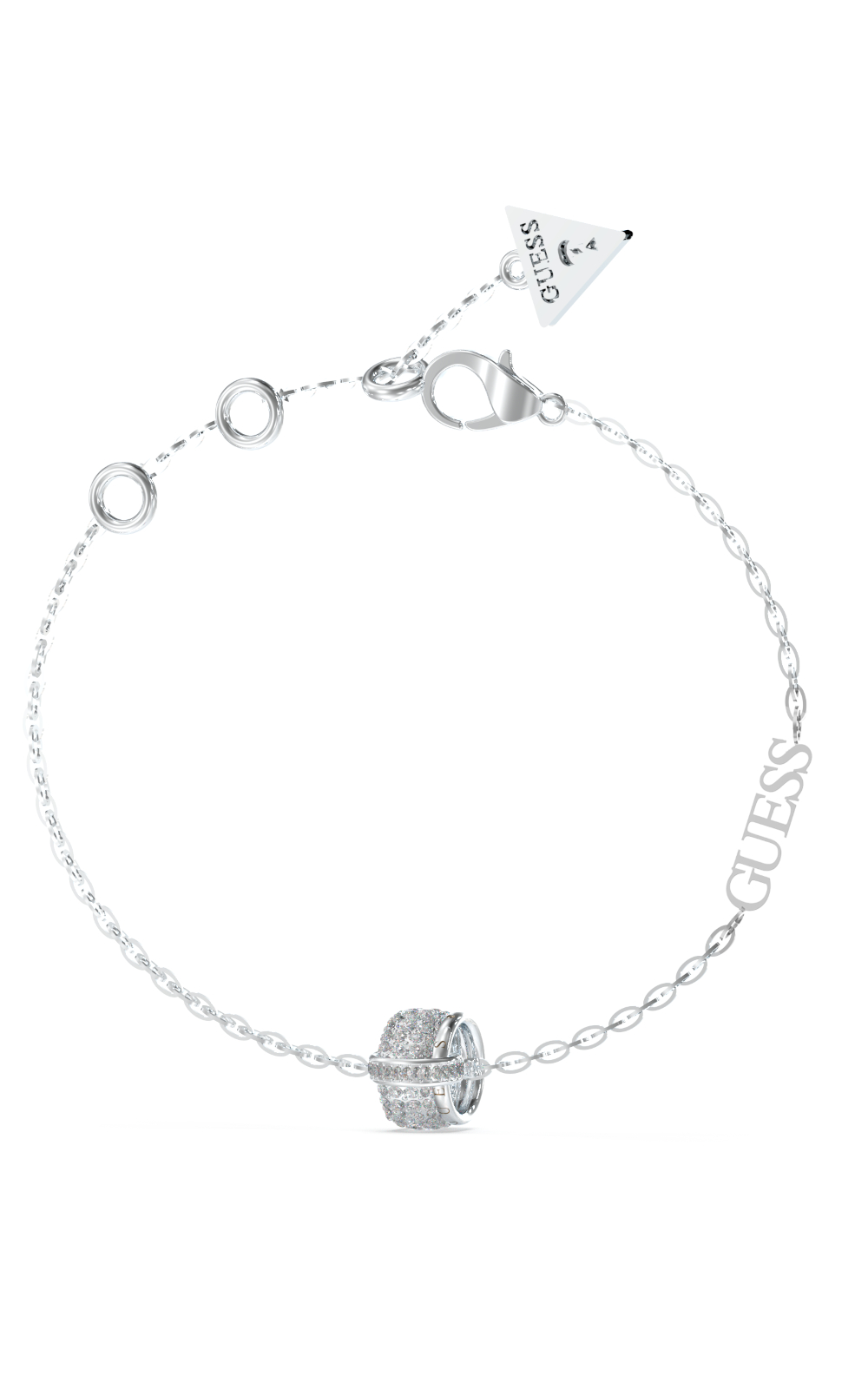 Γυναικείο βραχιόλι GUESS STEEL ασημένιου χρώματος. Έχει σχέδιο με πέτρες και λογότυπο(21cm).
