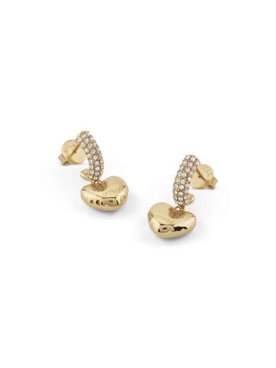 Γυναικεία σκουλαρίκια GUESS STEELκρίκοι, χρυσά με καρδιές με πέτρες και λογότυπο(2,2cm).