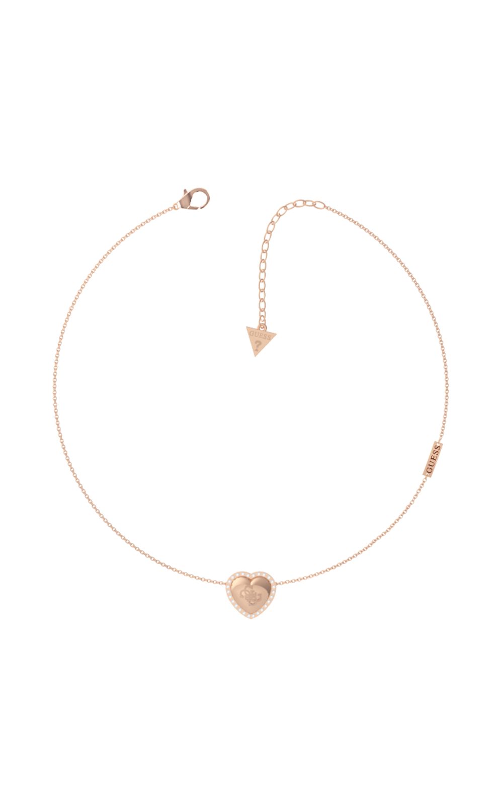 Γυναικείο κολιέ GUESS STEEL ροζ χρυσού χρώματος με καρδιά. Έχει το λογότυπο της εταιρείας και είναι διακοσμημένο με διαφανείς πέτρες (40,64-45,72cm).