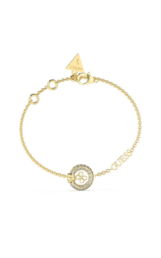 Γυναικείο βραχιόλι GUESS STEEL χρυσό με στρογγυλό σχέδιο λευκό χρώματος. Έχει το λογότυπο της εταιρείας και είναι διακοσμημένο με διαφανείς πέτρες (21cm).