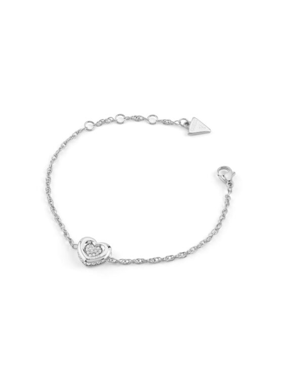 Γυναικείο βραχιόλι GUESS STEEL ασημένιου χρώματος. Είναι διακοσμημένο με καρδιά με λευκές πέτρες(21cm).