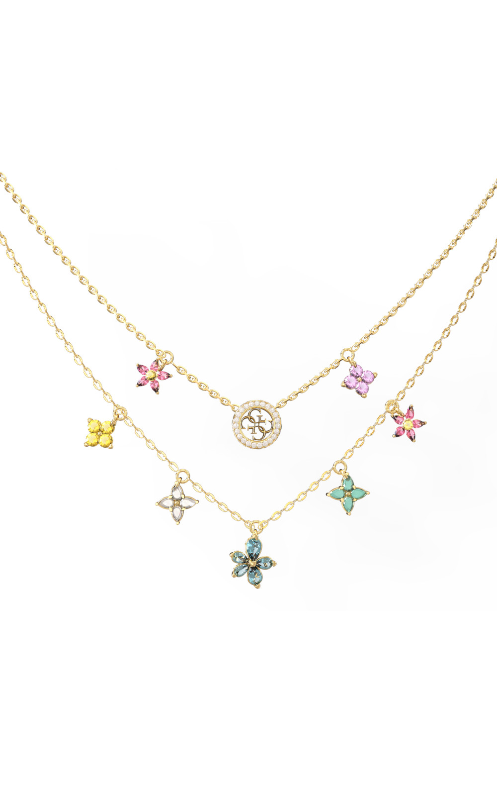 Γυναικείο κολιέ GUESS STEEL SECRET GARDEN JUBN06028JWYGMCT/U χρυσό με διπλή αλυσίδα, με πολύχρωμες πέτρες και λογότυπο(40,64-45,72cm).