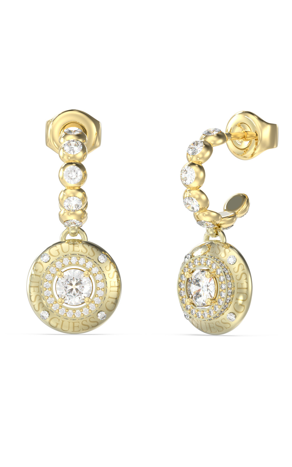 Γυναικεία σκουλαρίκια GUESS STEEL κρίκοι, χρυσά με κρεμαστό σχέδιο με πέτρες και λογότυπο(2,4cm).