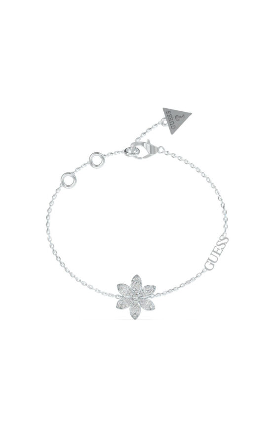 Γυναικείο βραχιόλι GUESS STEEL ασημένιο με λουλούδι. Έχει το λογότυπο της εταιρείας και είναι διακοσμημένο με διαφανείς πέτρες (21cm).