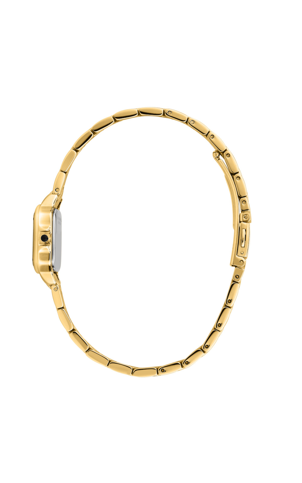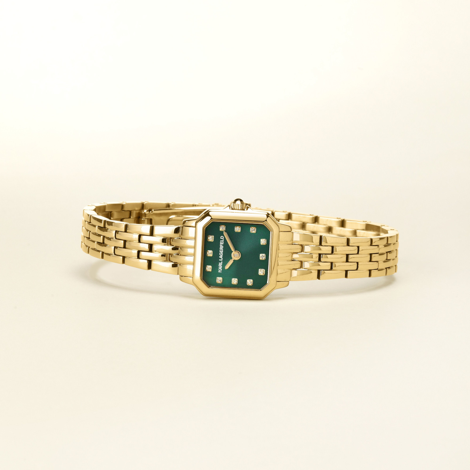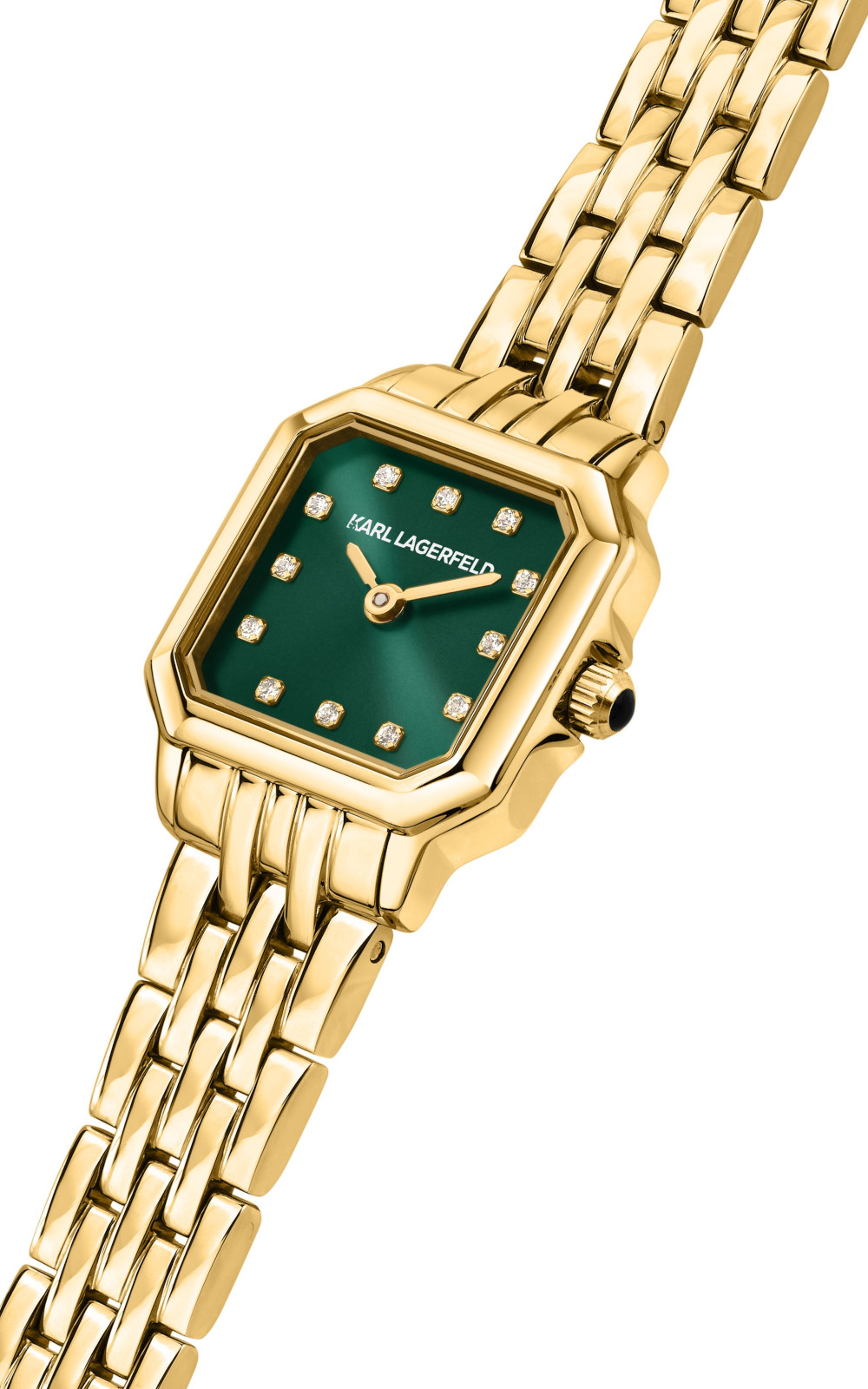 Γυναικείο ρολόι διαμέτρου 21x26mm με μηχανισμό Quartz ακριβείας. Έχει πράσινο καντράν με χρυσούς δείκτες και λεπτομέρειες και είναι διακοσμημένο με πέτρες. Η κάσα του είναι από ανοξείδωτο ατσάλι με κρύσταλλο από ορυκτό κρύσταλλο. Έχει μπρασελέ από ανοξείδωτο ατσάλι και κούμπωμα ασφαλείας. Δεν είναι αδιάβροχο.