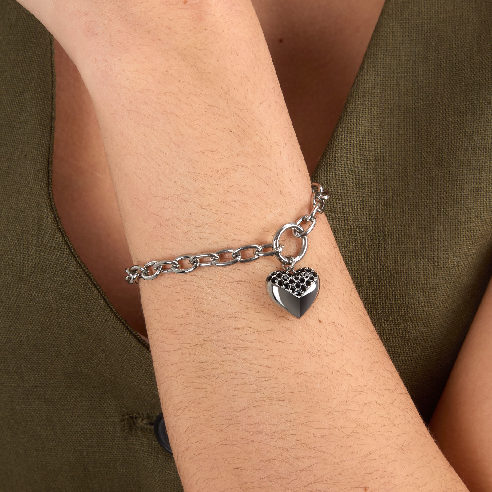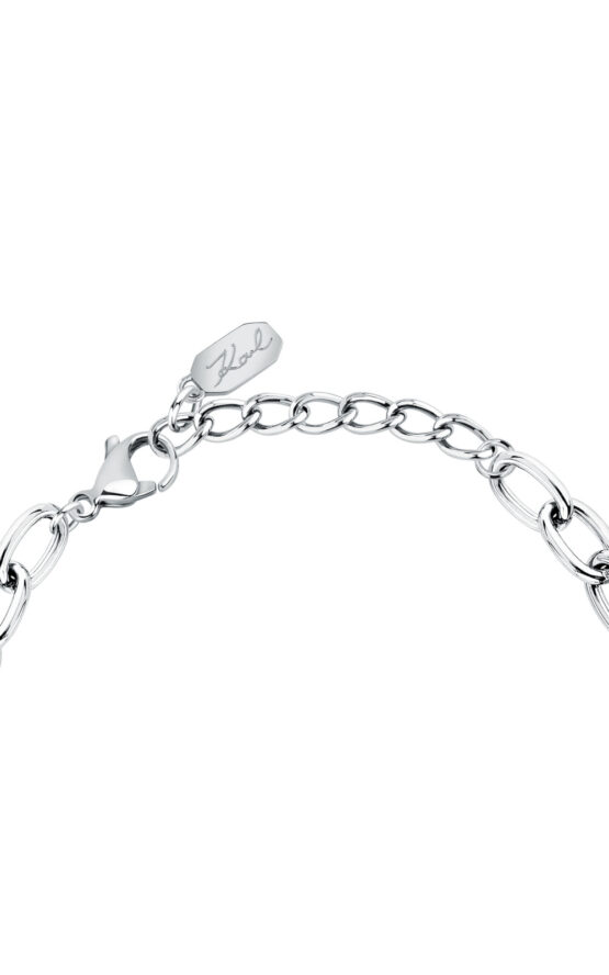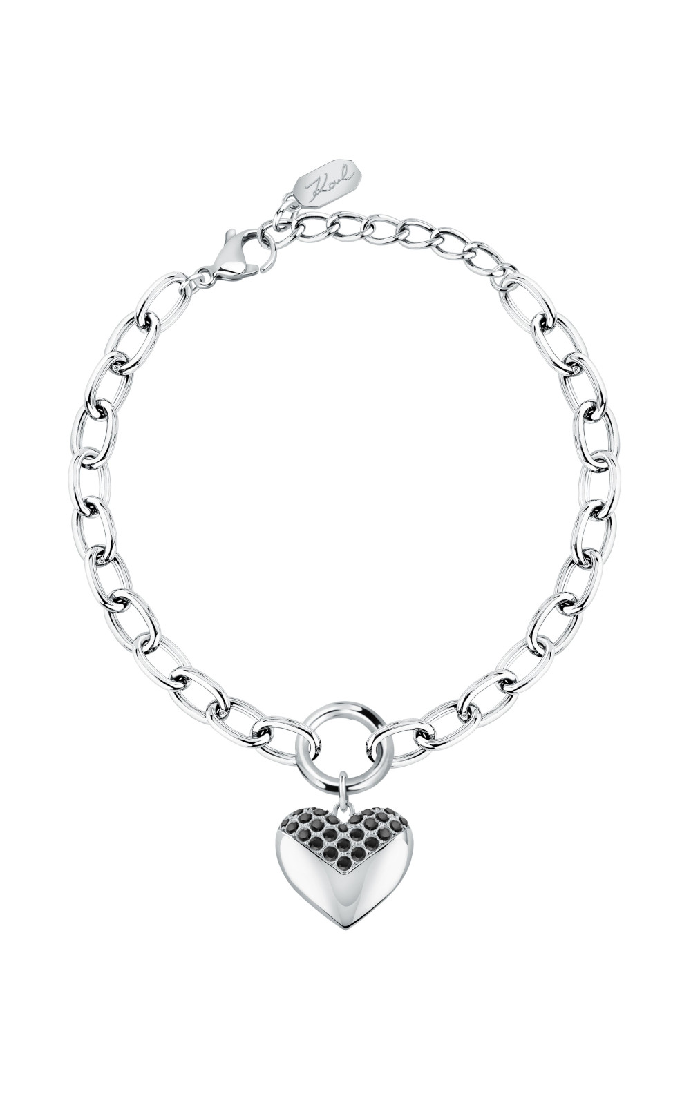 Γυναικείο βραχιόλι KARL LAGERFELD ασημένιου χρώματος. Είναι κατασκευασμένο από ανοξείδωτο ατσάλι και είναι διακοσμημένο με καρδιά με πέτρες(17+3cm).