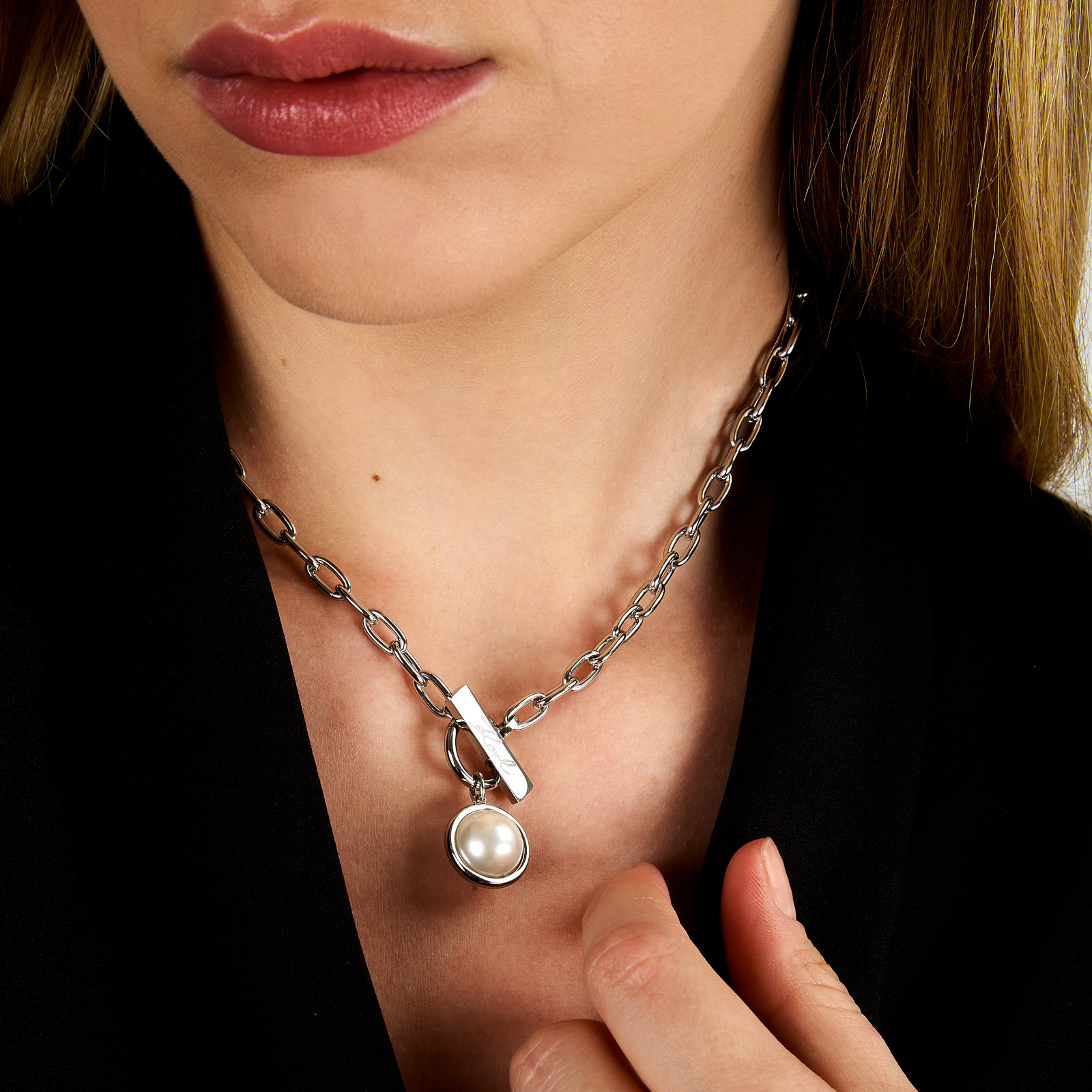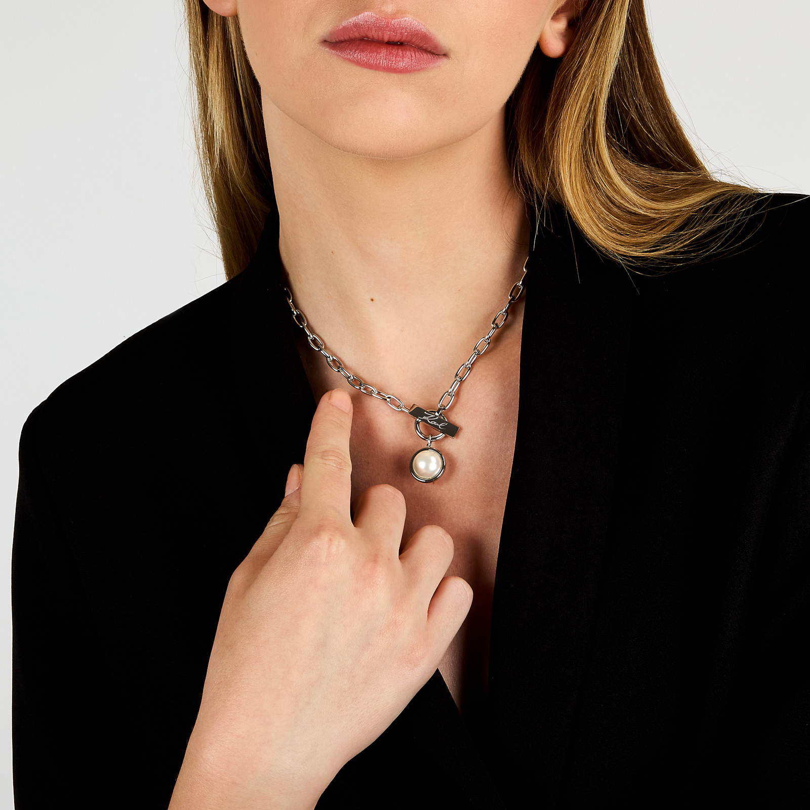 Γυναικείο κολιέ KARL LAGERFELD ασημένιου χρώματος. Είναι κατασκευασμένο από ανοξείδωτο ατσάλι και είναι διακοσμημένο με σχέδιο με πέρλα(40+5cm).
