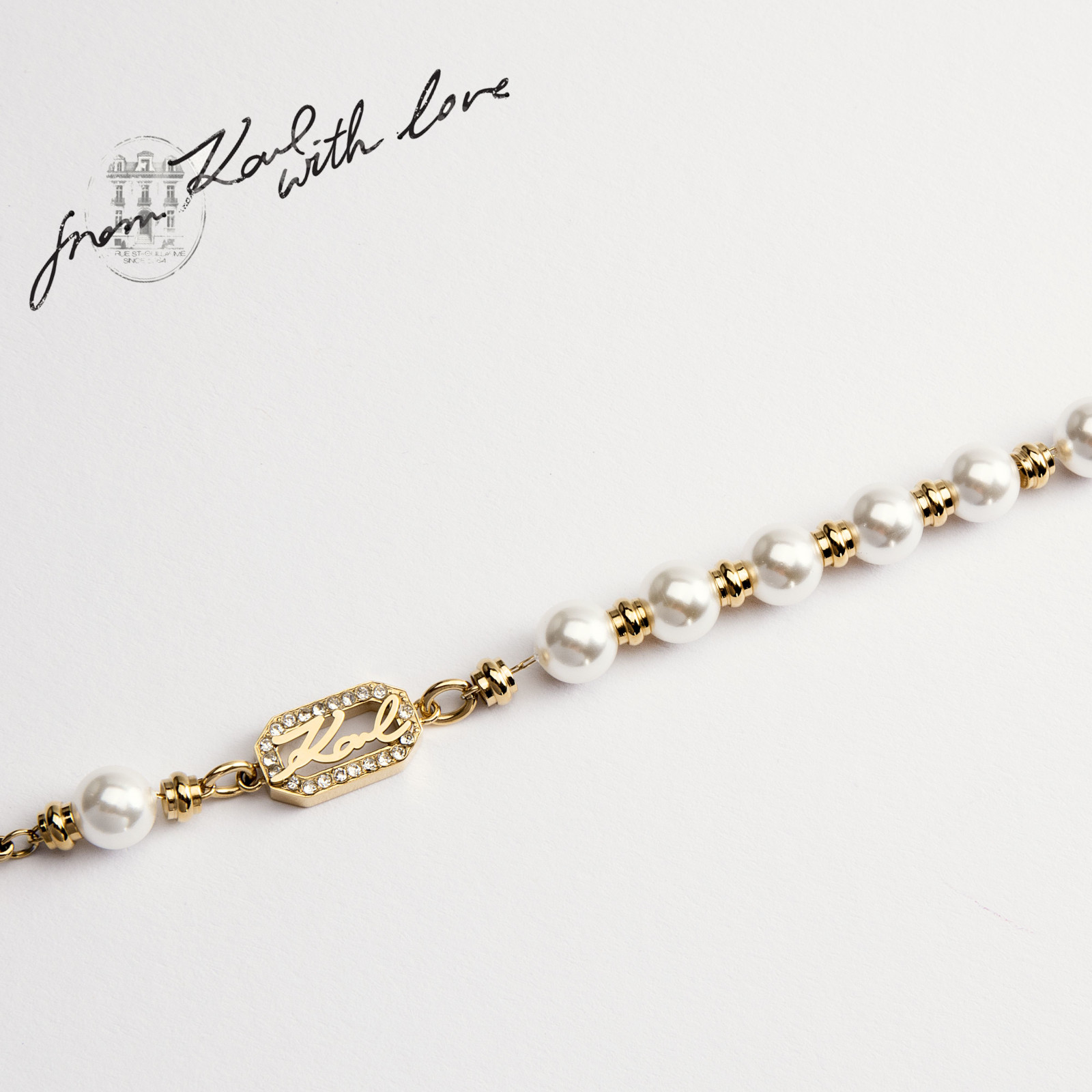 Γυναικείο βραχιόλι KARL LAGERFELD χρυσού χρώματος. Είναι κατασκευασμένο από ανοξείδωτο ατσάλι και είναι διακοσμημένο με πέρλες και λογότυπο(18+3cm).