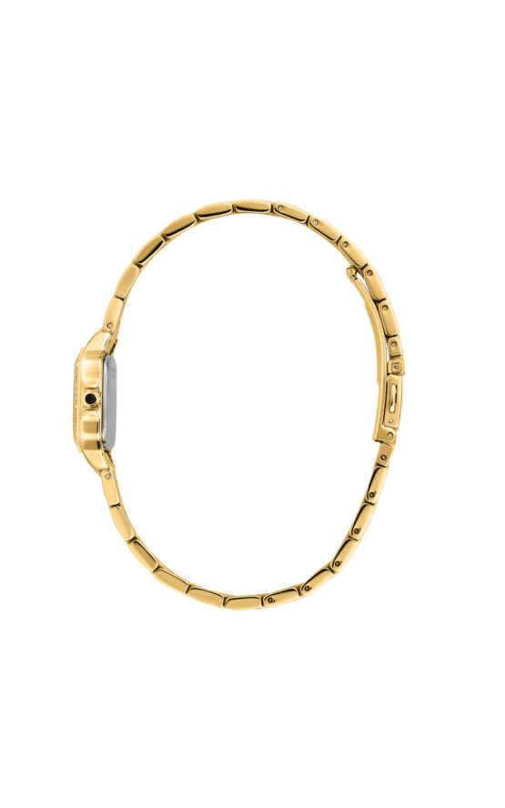 Γυναικείο ρολόι διαμέτρου 21x26mm με μηχανισμό Quartz ακριβείας. Έχει λευκό καντράν με χρυσούς δείκτες και λεπτομέρειες και είναι διακοσμημένο με πέτρες. Η κάσα του είναι από ανοξείδωτο ατσάλι με κρύσταλλο από ορυκτό κρύσταλλο. Έχει μπρασελέ από ανοξείδωτο ατσάλι και κούμπωμα ασφαλείας. Δεν είναι αδιάβροχο.