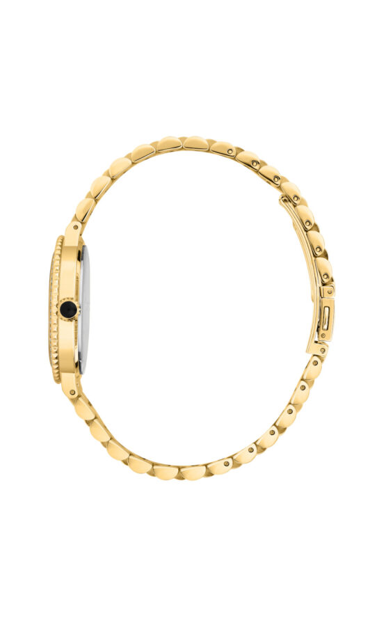 Γυναικείο ρολόι διαμέτρου 36mm με μηχανισμό Quartz ακριβείας. Έχει χρυσό καντράν με χρυσούς δείκτες και είναι διακοσμημένο με πέτρες. Η κάσα του είναι από ανοξείδωτο ατσάλι με κρύσταλλο από ορυκτό κρύσταλλο. Έχει μπρασελέ από ανοξείδωτο ατσάλι και κούμπωμα ασφαλείας. Είναι αδιάβροχο (5 ΑΤΜ).