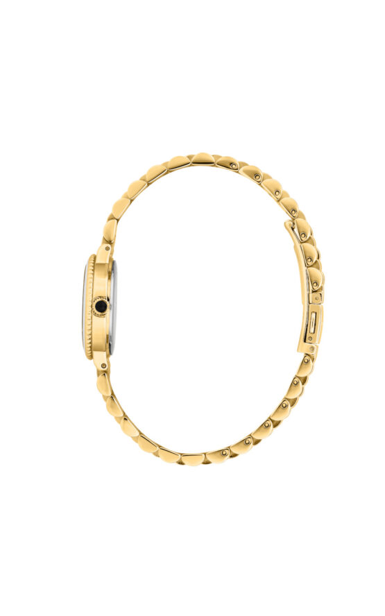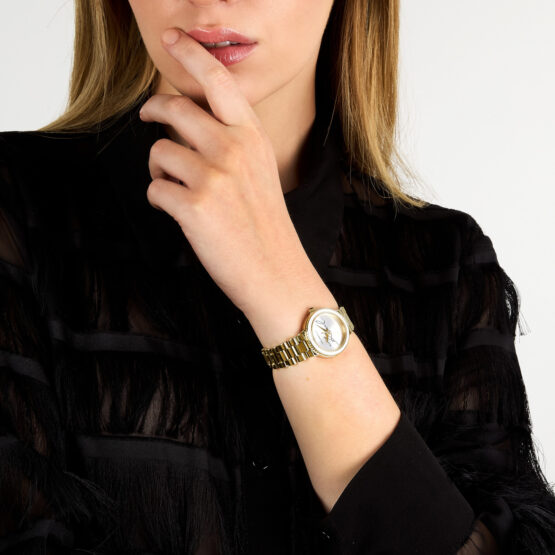 Γυναικείο ρολόι διαμέτρου 28mm με μηχανισμό Quartz ακριβείας. Έχει λευκό καντράν με χρυσούς δείκτες και λεπτομέρειες. Η κάσα του είναι από ανοξείδωτο ατσάλι με κρύσταλλο από ορυκτό κρύσταλλο. Έχει μπρασελέ από ανοξείδωτο ατσάλι και κούμπωμα ασφαλείας. Είναι αδιάβροχο (5 ΑΤΜ).
