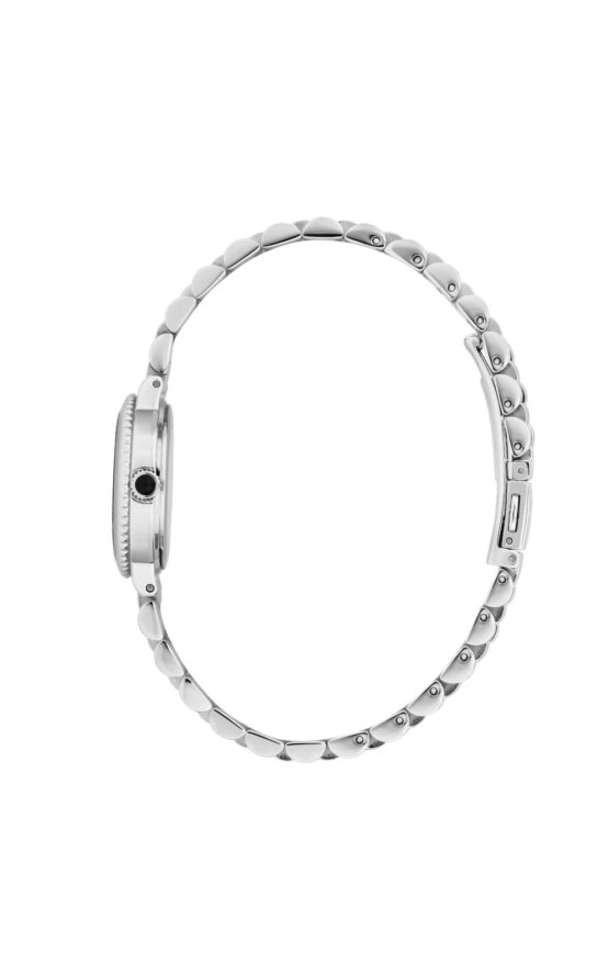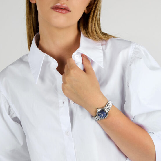 Γυναικείο ρολόι διαμέτρου 28mm με μηχανισμό Quartz ακριβείας. Έχει μπλε καντράν με ασημένιους δείκτες και είναι διακοσμημένο με πέτρες. Η κάσα του είναι από ανοξείδωτο ατσάλι με κρύσταλλο από ορυκτό κρύσταλλο. Έχει μπρασελέ από ανοξείδωτο ατσάλι και κούμπωμα ασφαλείας. Είναι αδιάβροχο (5 ΑΤΜ).