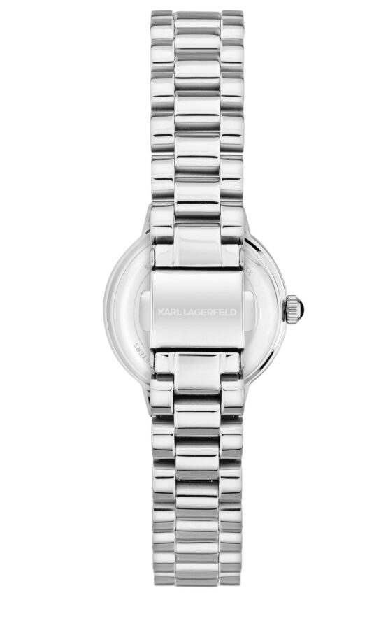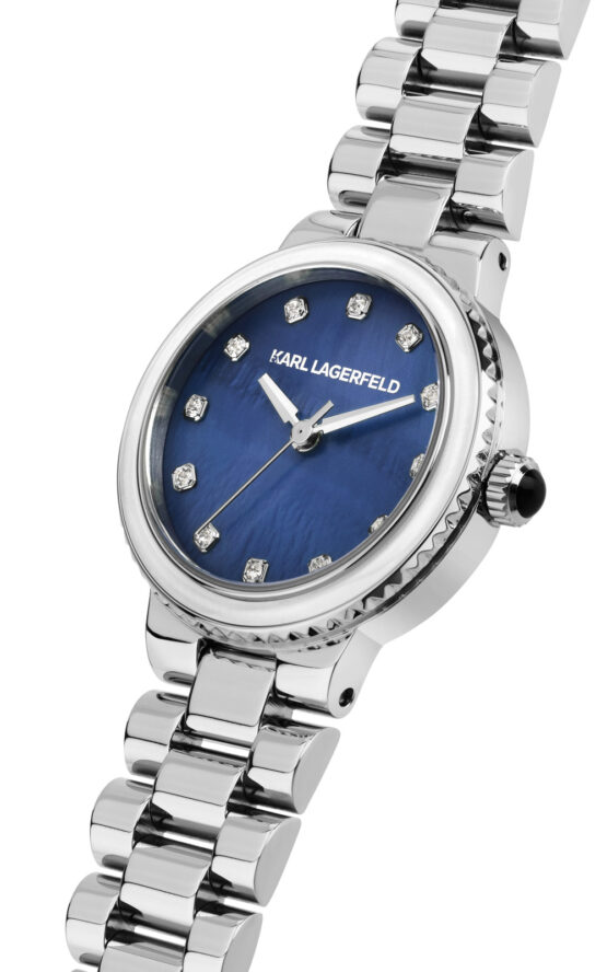 Γυναικείο ρολόι KARL LAGERFELD KAISER R0553104513 διαμέτρου 28mm, με μηχανισμό QUARTZ ακριβείας, μπλε καντράν, κάσα και μπρασελέ από ανοξείδωτο ατσάλι και κούμπωμα ασφαλείας.