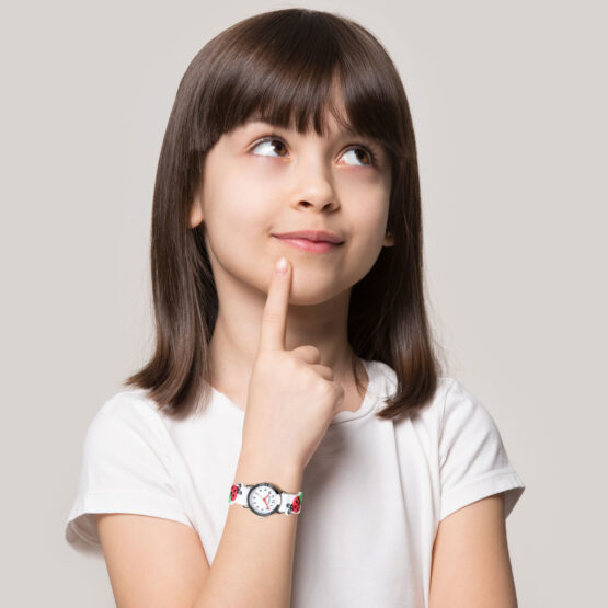 Παιδικό ρολόι διαμέτρου 26mm με μηχανισμό QUARTZ ακριβείας. Έχει λευκό καντράν με κόκκινους δείκτες και μαύρες λεπτομέρειες. Η κάσα του είναι μεταλλική με κρύσταλλο από ορυκτό κρύσταλλο ειδικής σκλήρυνσης. Έχει λευκό καουτσούκ λουράκι με πασχαλίτσες και κούμπωμα τοκάς. Δεν είναι αδιάβροχο.