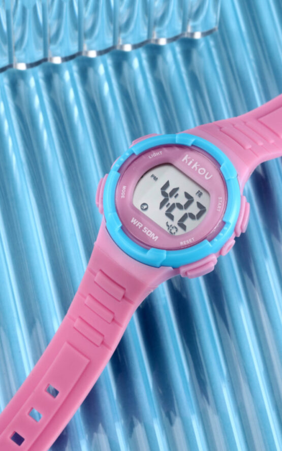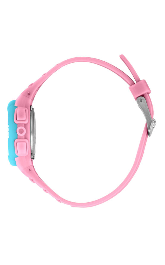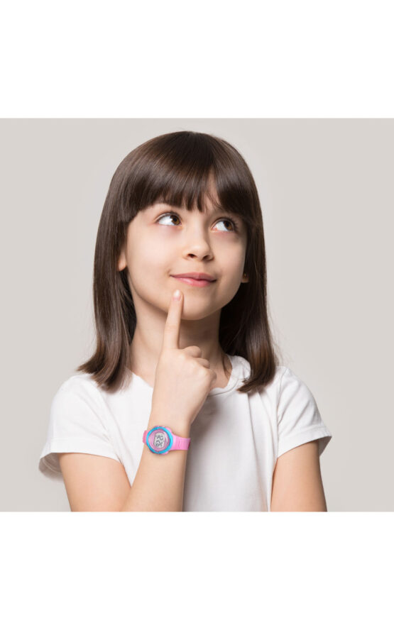 Παιδικό ρολόι διαμέτρου 31mm με μηχανισμό QUARTZ ακριβείας. Έχει λευκό καντράν με μαύρες ενδείξεις. Η κάσα του είναι ροζ και γαλάζια πλαστική με κρύσταλλο από πλαστικό φακό. Έχει ροζ πλαστικό λουράκι και κούμπωμα τοκάς. Δεν είναι αδιάβροχο.