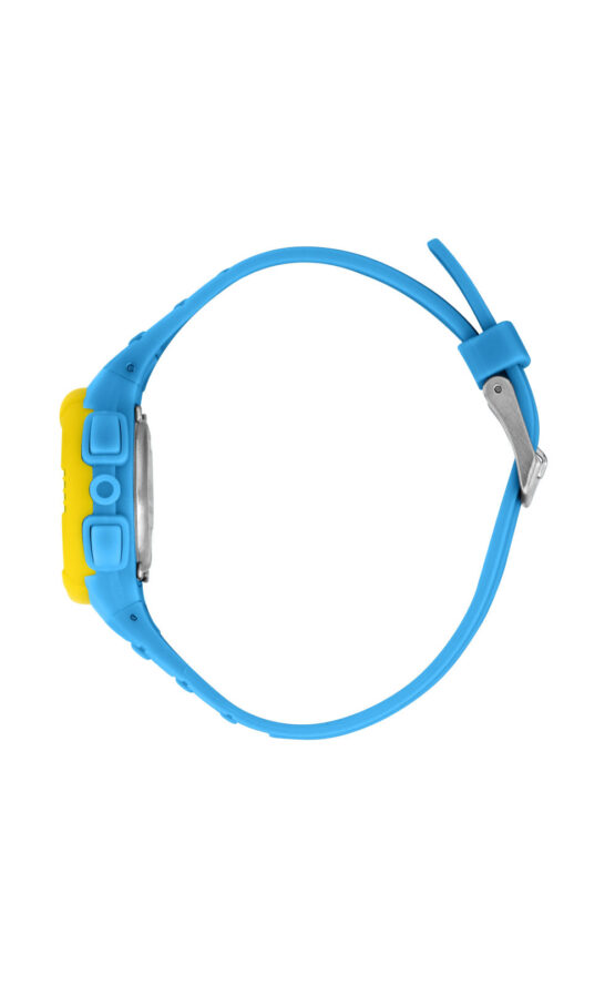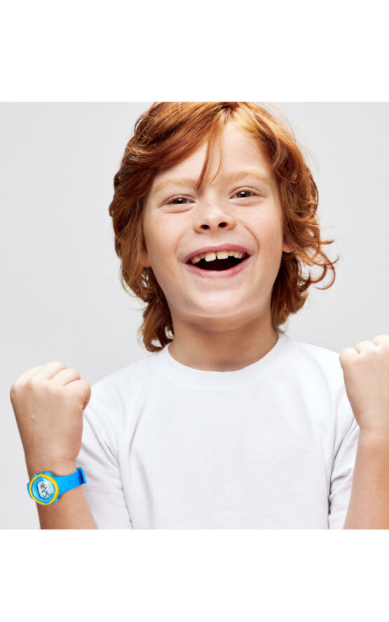 Παιδικό ρολόι διαμέτρου 31mm με μηχανισμό QUARTZ ακριβείας. Έχει λευκό καντράν με μαύρες ενδείξεις. Η κάσα του είναι γαλάζια και κίτρινη πλαστική με κρύσταλλο από πλαστικό φακό. Έχει γαλάζιο πλαστικό λουράκι και κούμπωμα τοκάς. Δεν είναι αδιάβροχο.
