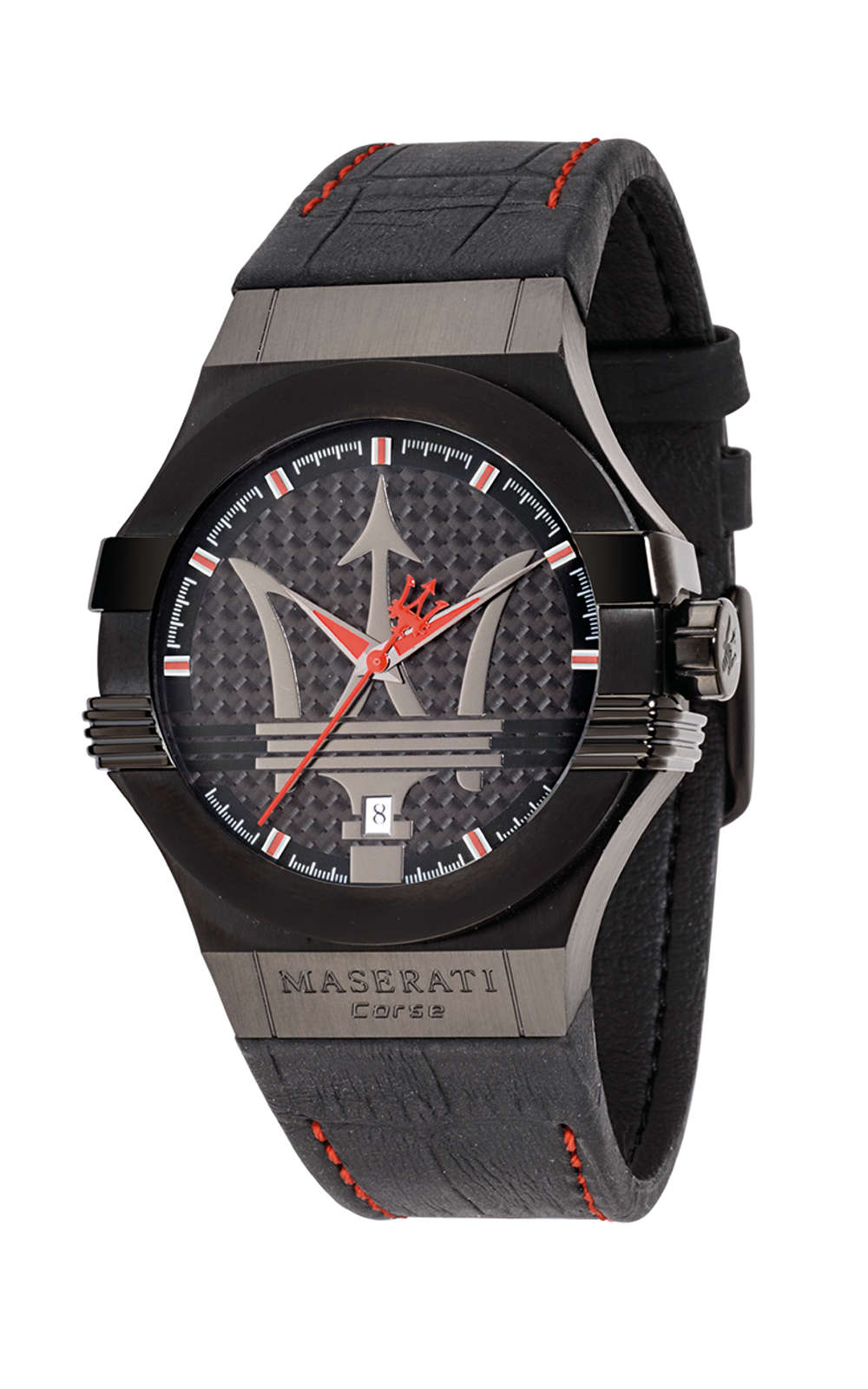 Ανδρικό ρολόι MASERATI R8851108010 διαμέτρου 42mm, με μηχανισμό QUARTZ ακριβείας, μαύρο καντράν, κάσα από ανοξείδωτο ατσάλι και μαύρο δερμάτινο λουράκι.