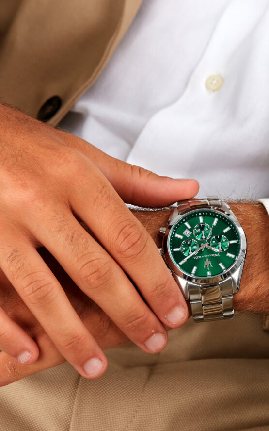 Ανδρικό ρολόι MASERATI ATTRAZIONE R8853151011 διαμέτρου 43mm, με μηχανισμό Quartz Multifuction, πράσινο καντράν και κάσα – μπρασελέ από ανοξείδωτο ατσάλι.
