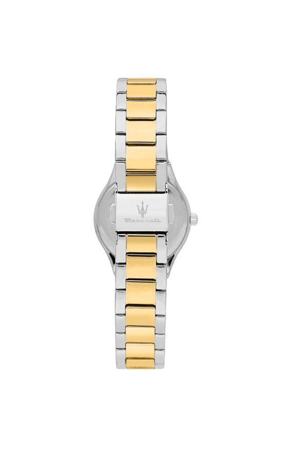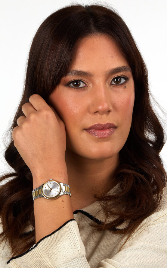 Γυναικείο ρολόι διαμέτρου 30mm με μηχανισμό QUARTZ ακριβείας. Έχει ασημένιο καντράν διακομισμένο με διαμαντάκια και επίχρυσους δείκτες. Η κάσα του είναι από ανοξείδωτο ατσάλι με κρύσταλλο από ορυκτό κρύσταλλο ειδικής σκλήρυνσης. Έχει μπρασελέ από ανοξείδωτο ατσάλι και κούμπωμα ασφαλείας. Είναι αδιάβροχο (5 ΑΤΜ).