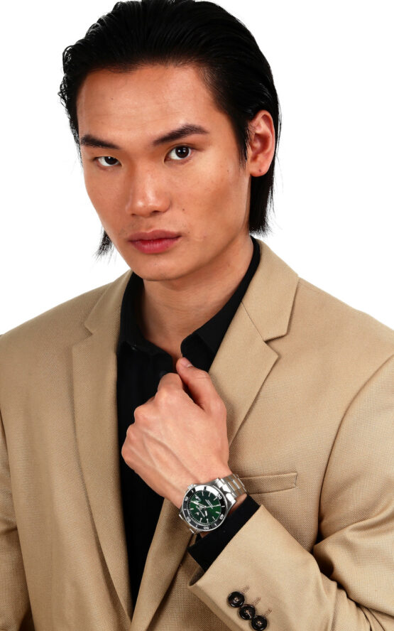 Ανδρικό ρολόι διαμέτρου 43mm με μηχανισμό QUARTZ ακριβείας. Έχει πράσινο καντράν με ασημένιους δείκτες, λεπτομέρειες και ένδειξη ημερομηνίας. Η κάσα του είναι από ανοξείδωτο ατσάλι και κρύσταλλο από ορυκτό κρύσταλλο ειδικής σκλήρυνσης. Έχει μπρασελέ από ανοξείδωτο ατσάλι και κούμπωμα ασφαλείας. Είναι αδιάβροχο (10 ΑΤΜ).