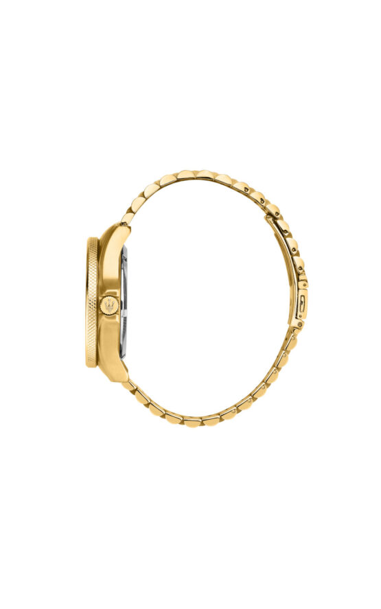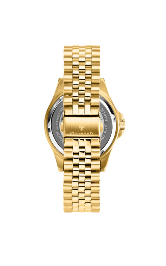 Ανδρικό ρολόι διαμέτρου 44mm με αυτόματο μηχανισμό. Έχει μαύρο καντράν με χρυσούς δείκτες με διαμάντια. Η κάσα του είναι χρυσή από ανοξείδωτο ατσάλι και κρύσταλλο από ορυκτό κρύσταλλο. Έχει χρυσό μπρασελέ από ανοξείδωτο ατσάλι και κούμπωμα ασφαλείας. Είναι αδιάβροχο (10 ΑΤΜ). Η συσκευασία περιλαμβάνει και δερμάτινο λουράκι, μαύρου χρώματος.