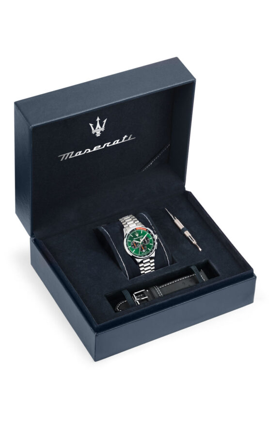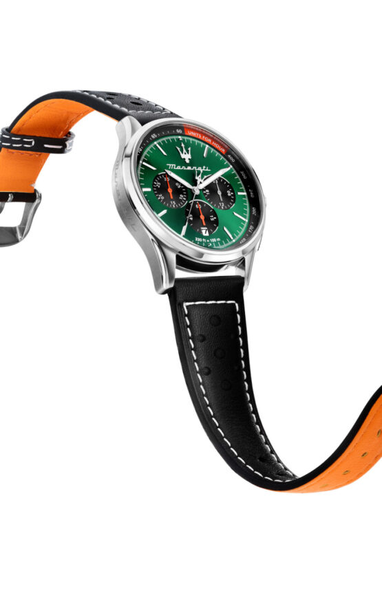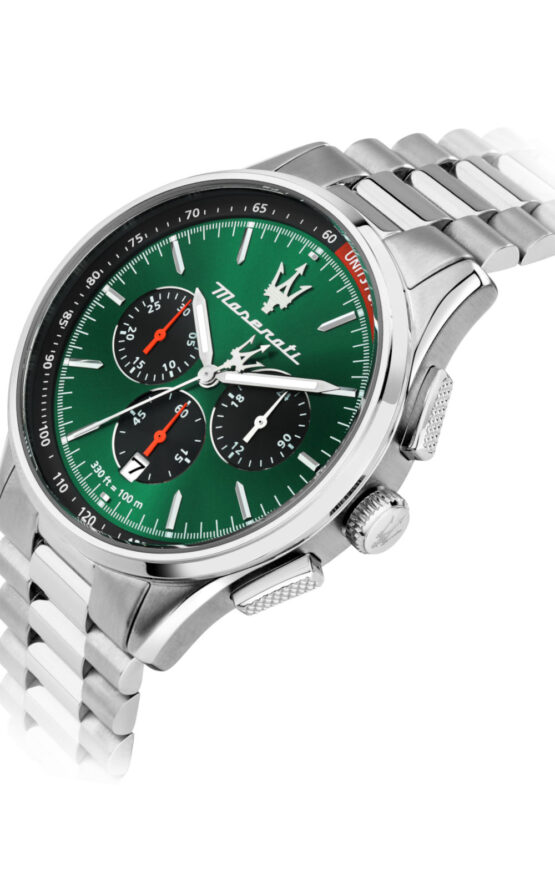 Ανδρικό ρολόι MASERATI SORPASSO R8873624002 διαμέτρου 42mm, με μηχανισμό Quartz χρονογράφος ακριβείας, πράσινο καντράν, κάσα και μπρασελέ από ανοξείδωτο ατσάλι.