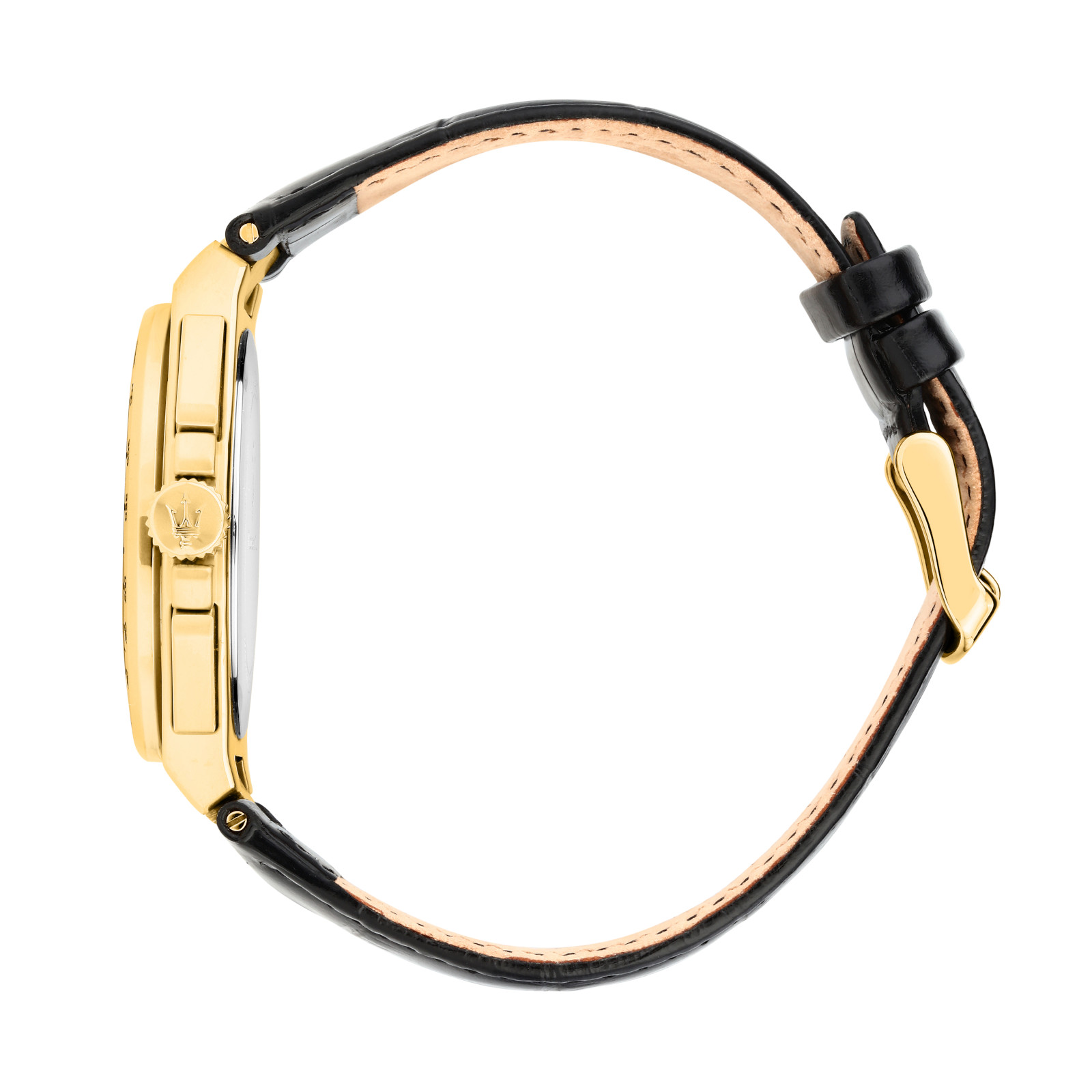 Ανδρικό ρολόι διαμέτρου 41mm με μηχανισμό Quartz Χρονογράφος Ακριβείας. Έχει μαύρο καντράν με χρυσούς δείκτες. Η κάσα του είναι χρυσή από ανοξείδωτο ατσάλι και κρύσταλλο από ορυκτό κρύσταλλο. Έχει δερμάτινο λουράκι και κούμπωμα τοκάς. Είναι αδιάβροχο (5 ΑΤΜ).