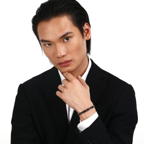 Ανδρικό βραχιόλι MASERATI ICONIC JM124AVD36 από ανοξείδωτο ατσάλι, ασημένιου και μαύρου χρώματος με ροζ χρυσή τρίαινα και λογότυπο(18,5+3cm).