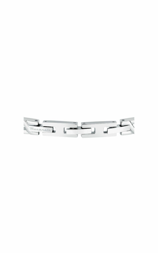 Ανδρικό βραχιόλι MASERATI από ανοξείδωτο ατσάλι. To βραχιόλι είναι ασημένιου και μαύρου χρώματος με σχέδιο ροζ χρυσή τρίαινα και λογότυπο της εταιρείας(18,5+3cm).