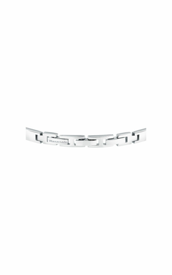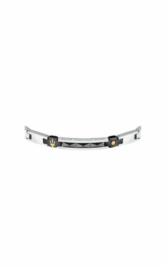 Ανδρικό βραχιόλι MASERATI από ανοξείδωτο ατσάλι με κεραμικά στοιχεία. To βραχιόλι είναι ασημένιου και μαύρου χρώματος με σχέδιο χρυσή τρίαινα και λογότυπο της εταιρείας(18,5+3cm).