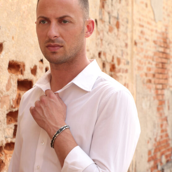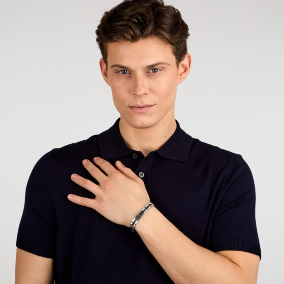 Ανδρικό βραχιόλι MASERATI από ανοξείδωτο ατσάλι. To βραχιόλι είναι μαύρου και ασημένιου χρώματος με ροζ επίχρυσες λεπτομέρειες. Έχει το λογότυπο της εταιρείας(21cm).