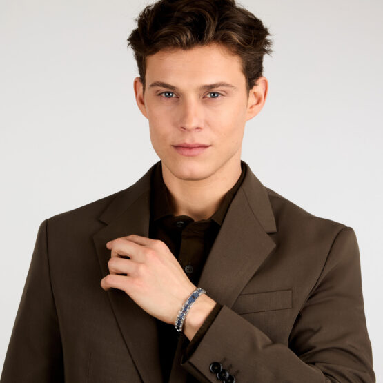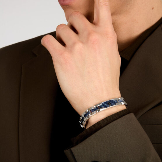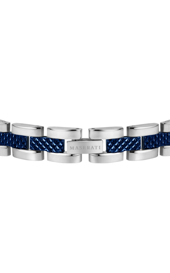 Ανδρικό βραχιόλι MASERATI από ανοξείδωτο ατσάλι. To βραχιόλι είναι ασημένιου και μπλε χρώματος με ανθρακί λεπτομέρειες. Έχει το λογότυπο της εταιρείας(21cm).