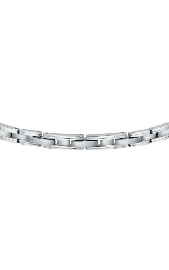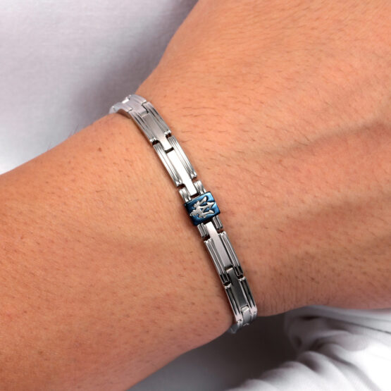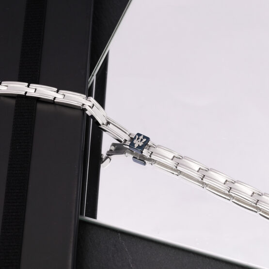 Ανδρικό βραχιόλι MASERATI από ανοξείδωτο ατσάλι. To βραχιόλι είναι ασημένιου με λεπτομέρειες μπλε χρώματος και έχει το λογότυπο της εταιρείας(22cm).