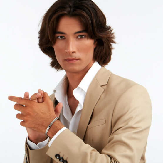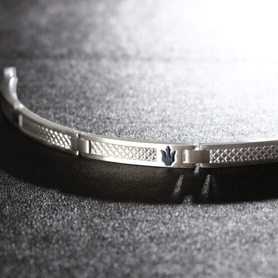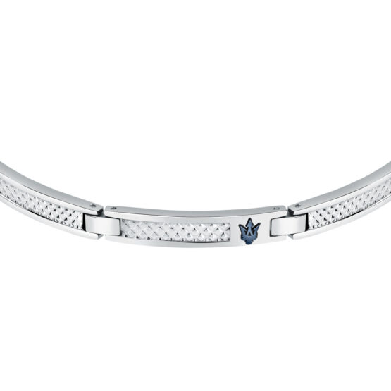 Ανδρικό βραχιόλι MASERATI από ανοξείδωτο ατσάλι. To βραχιόλι είναι ασημένιου χρώματος και έχει μπλε λογότυπο της εταιρείας(18+3,5cm).