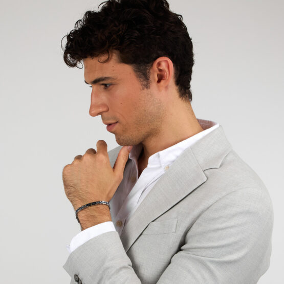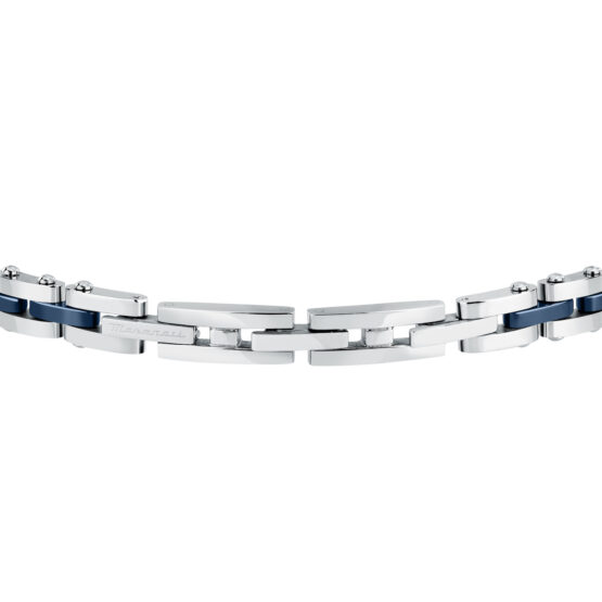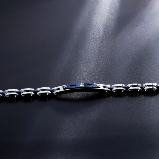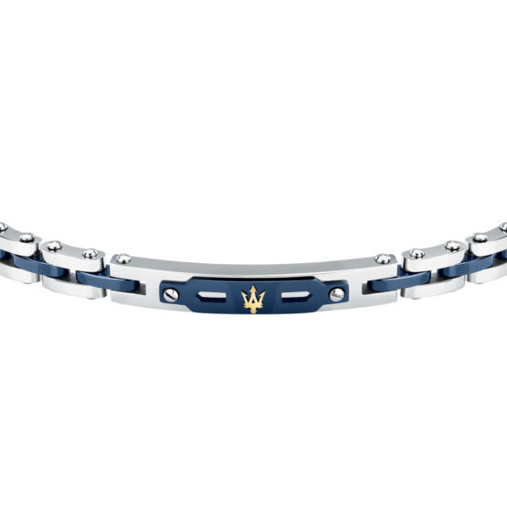 Ανδρικό βραχιόλι MASERATI από ανοξείδωτο ατσάλι με κεραμικά στοιχεία. To βραχιόλι είναι ασημένιου και μπλε χρώματος με σχέδιο χρυσή τρίαινα και λογότυπο της εταιρείας(18+3,5cm).