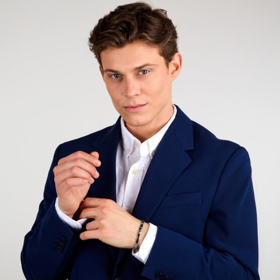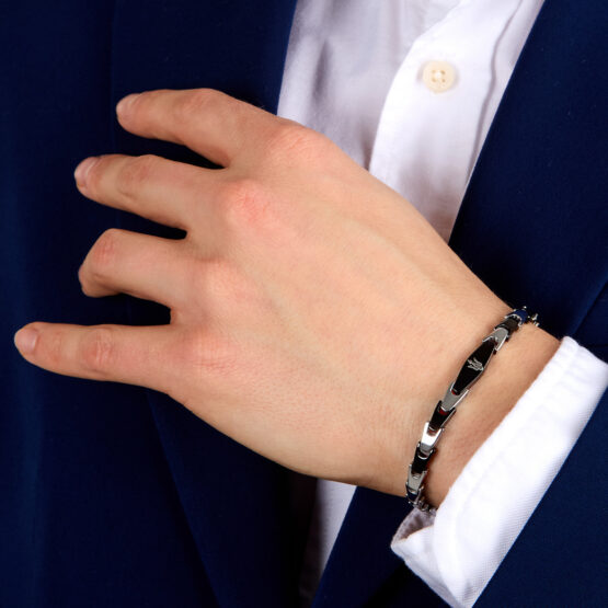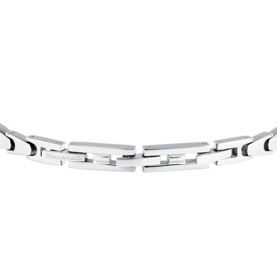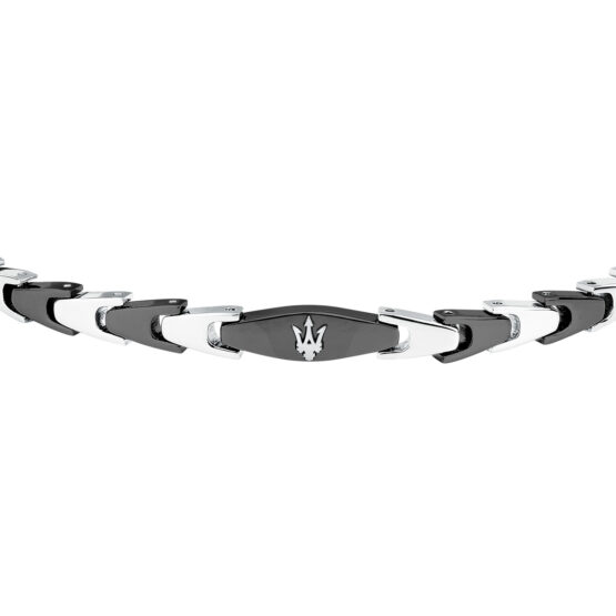 Ανδρικό βραχιόλι MASERATI από ανοξείδωτο ατσάλι. To βραχιόλι είναι μαύρου και ασημένιου χρώματος με σχέδιο ασημένια τρίαινα και λογότυπο της εταιρείας(18+3,5cm).