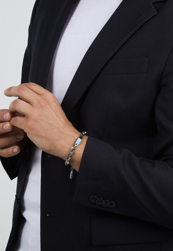 Ανδρικό βραχιόλι MASERATI ICONIC JM425AVD105 από ανοξείδωτο ατσάλι,ασημένιου και μπλε χρώματος με ασημένια τρίαινα(19+3cm).