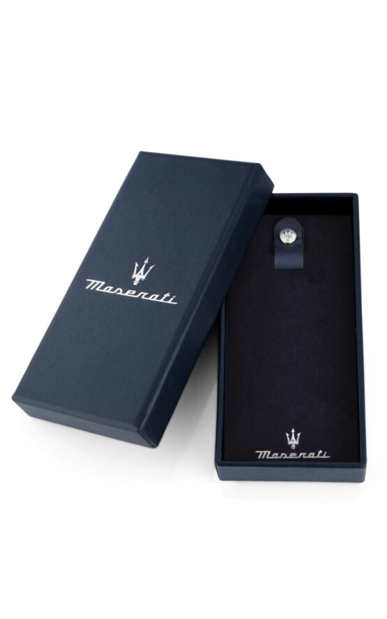 Μπρελόκ MASERATI μαύρου χρώματος από ανοξείδωτο ατσάλι. Το μπρελόκ έχει το λογότυπο της εταιρείας.