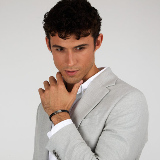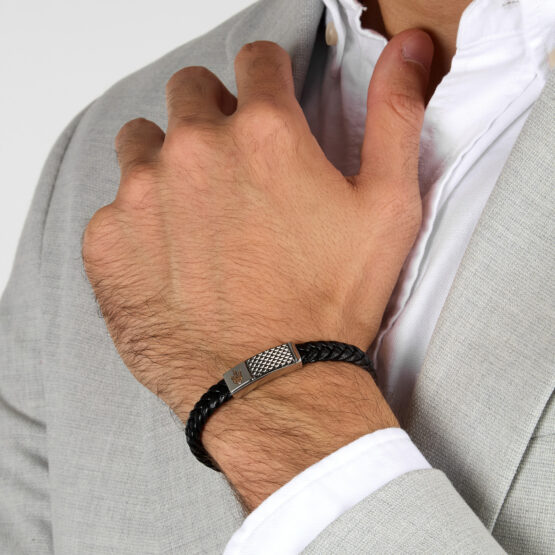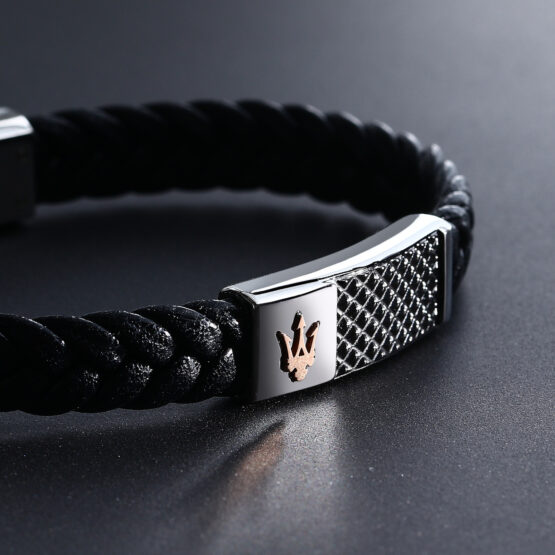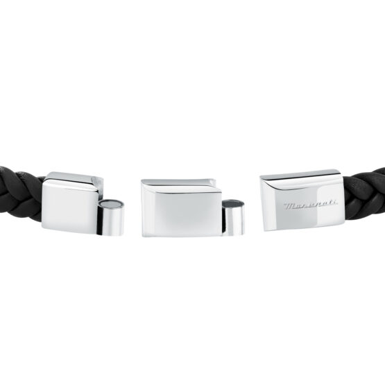 Ανδρικό βραχιόλι MASERATI με μαύρο δερμάτινο λουράκι. To βραχιόλι έχει ασημένιες και μαύρες λεπτομέρειες από ανοξείδωτο ατσάλι και το λογότυπο της εταιρείας(19+1cm).