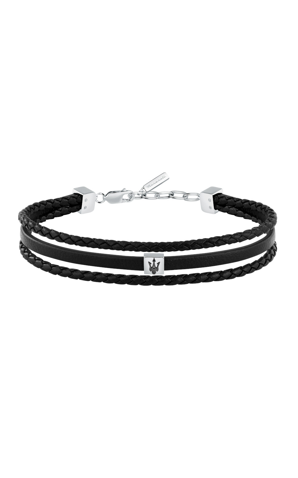 Ανδρικό βραχιόλι MASERATI με μαύρο δερμάτινο λουράκι τριπλό. To βραχιόλι έχει ασημένιες και μαύρες λεπτομέρειες από ανοξείδωτο ατσάλι και το λογότυπο της εταιρείας(19+3cm).
