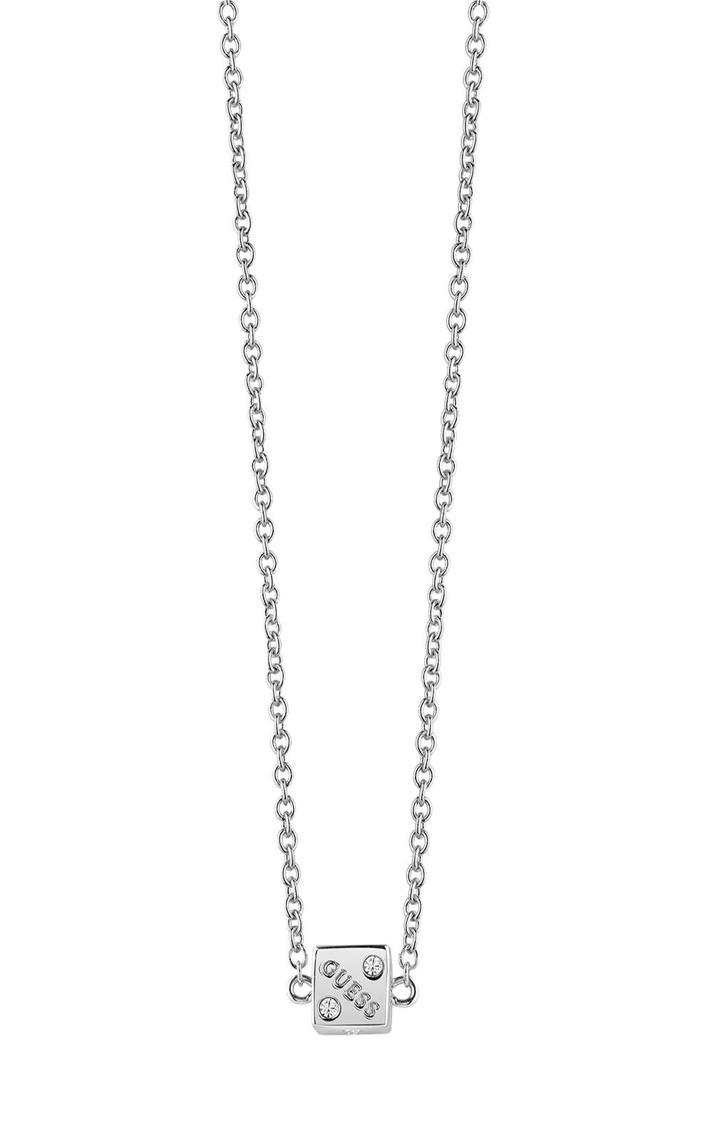 Γυναικείο κολιέ GUESS FAUX ROLLING DICE UBN83055 ασημένιου χρώματος με σχέδιο ζάρι, διαφανείς πέτρες ζιργκόν και λογότυπο της εταιρείας.