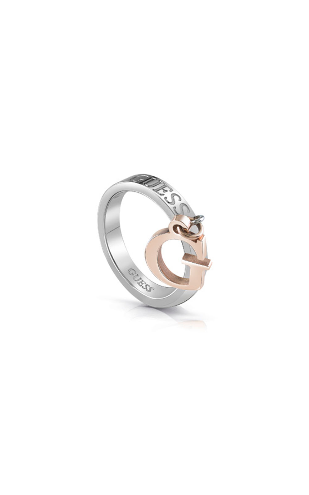 Γυναικείο δαχτυλίδι GUESS FAUX ασημένιου χρώματος με charm το λογότυπο της εταιρείας, ροζ χρυσού χρώματος.
