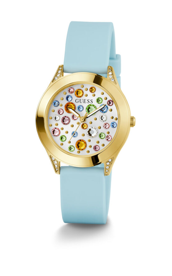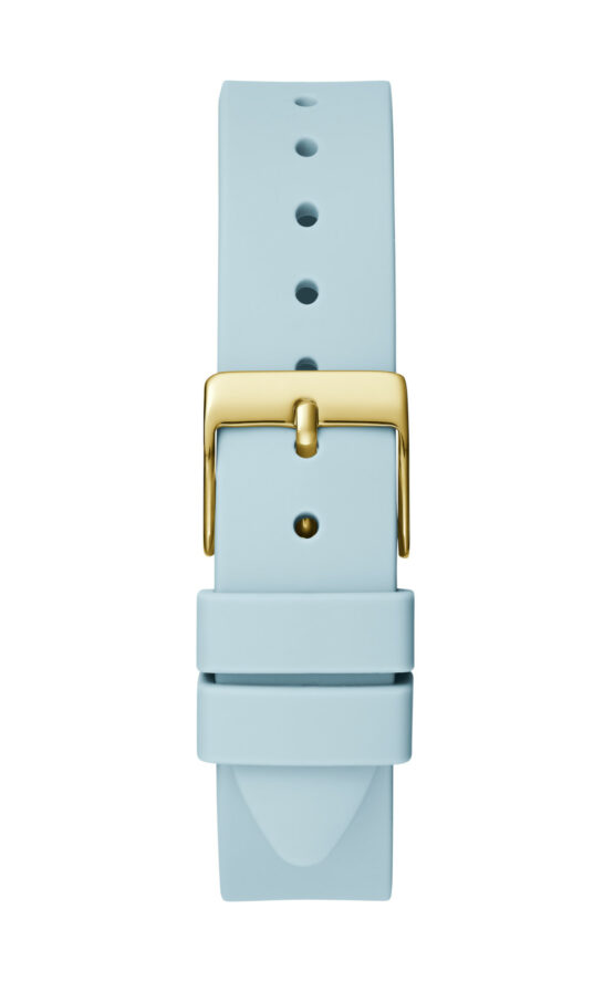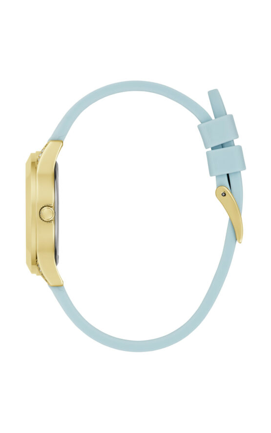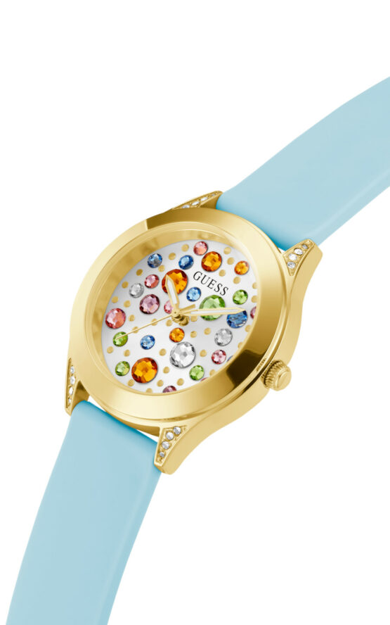 Γυναικείο ρολόι GUESS MINI WONDERLUST GW0678L1 διαμέτρου 34mm, με μηχανισμό Quartz ακριβείας, ασημένιο καντράν, επίχρυση κάσα και γαλάζιο καουτσούκ λουράκι.