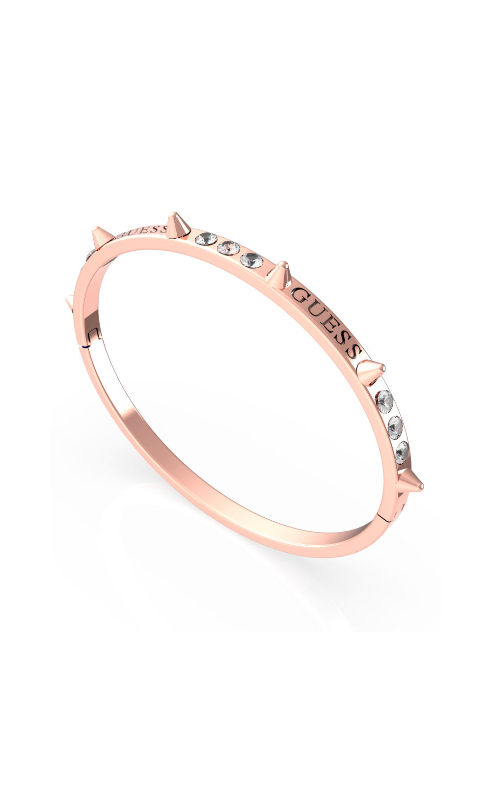 Γυναικείο βραχιόλι GUESS STEEL ροζ χρυσού χρώματος με καρφιά και λογότυπο της εταιρείας. Είναι διακοσμημένο με διαφανείς πέτρες ζιργκόν(5,8×4,9cm).