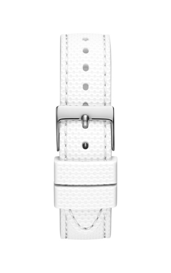 Γυναικείο ρολόι GUESS DART W1296L1 διαμέτρου 38mm, με μηχανισμό QUARTZ χρονογράφου ακριβείας, λευκό καντράν, πολυανθρακική κάσα και λευκό καουτσούκ λουράκι.