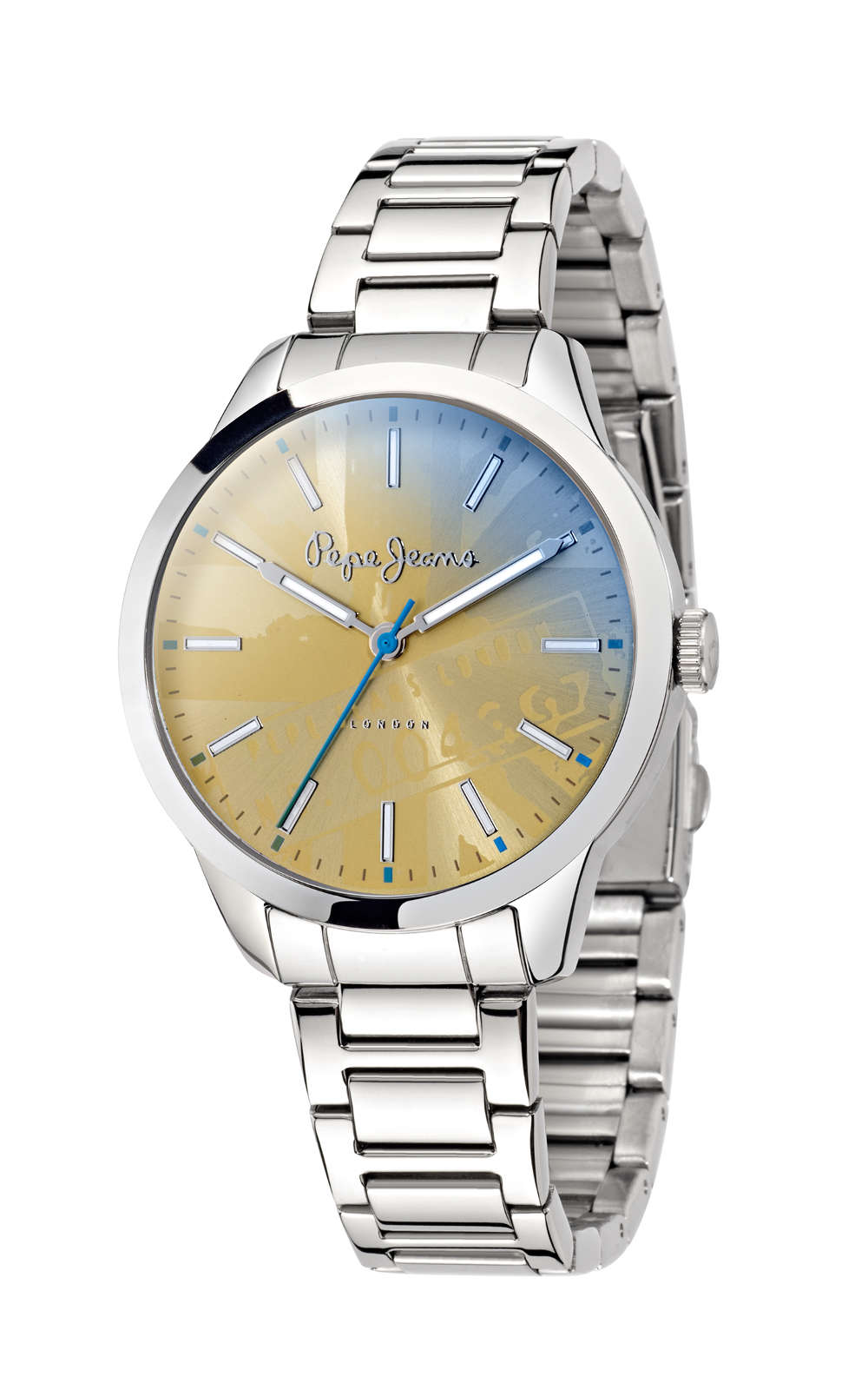 Γυναικείο ρολόι PEPE JEAN R2353121506 διαμέτρου 40mm, με μηχανισμό QUARTZ ακριβείας, κίτρινο και μπλε καντράν, κάσα και μπρασελέ από ανοξείδωτο ατσάλι.