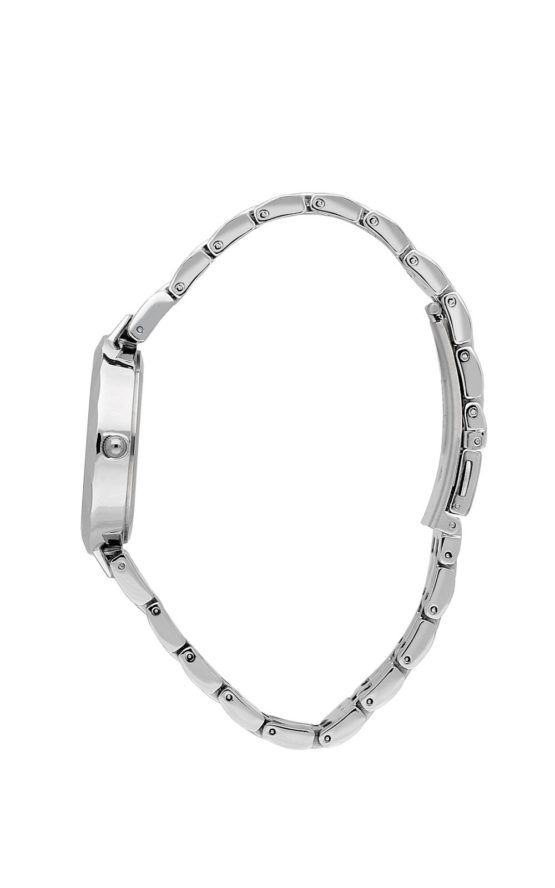 Γυναικείο ρολόι διαμέτρου 34mm με μηχανισμό QUARTZ ακριβείας. Έχει λευκό καντράν διακοσμημένο με κρύσταλλα και ασημένιους δείκτες. Η κάσα του είναι μεταλλική ασημένιου χρώματος με κρύσταλλο από ορυκτό κρύσταλλο ειδικής σκλήρυνσης. Έχει ασημένιο μεταλλικό μπρασελέ και κούμπωμα ασφαλείας.