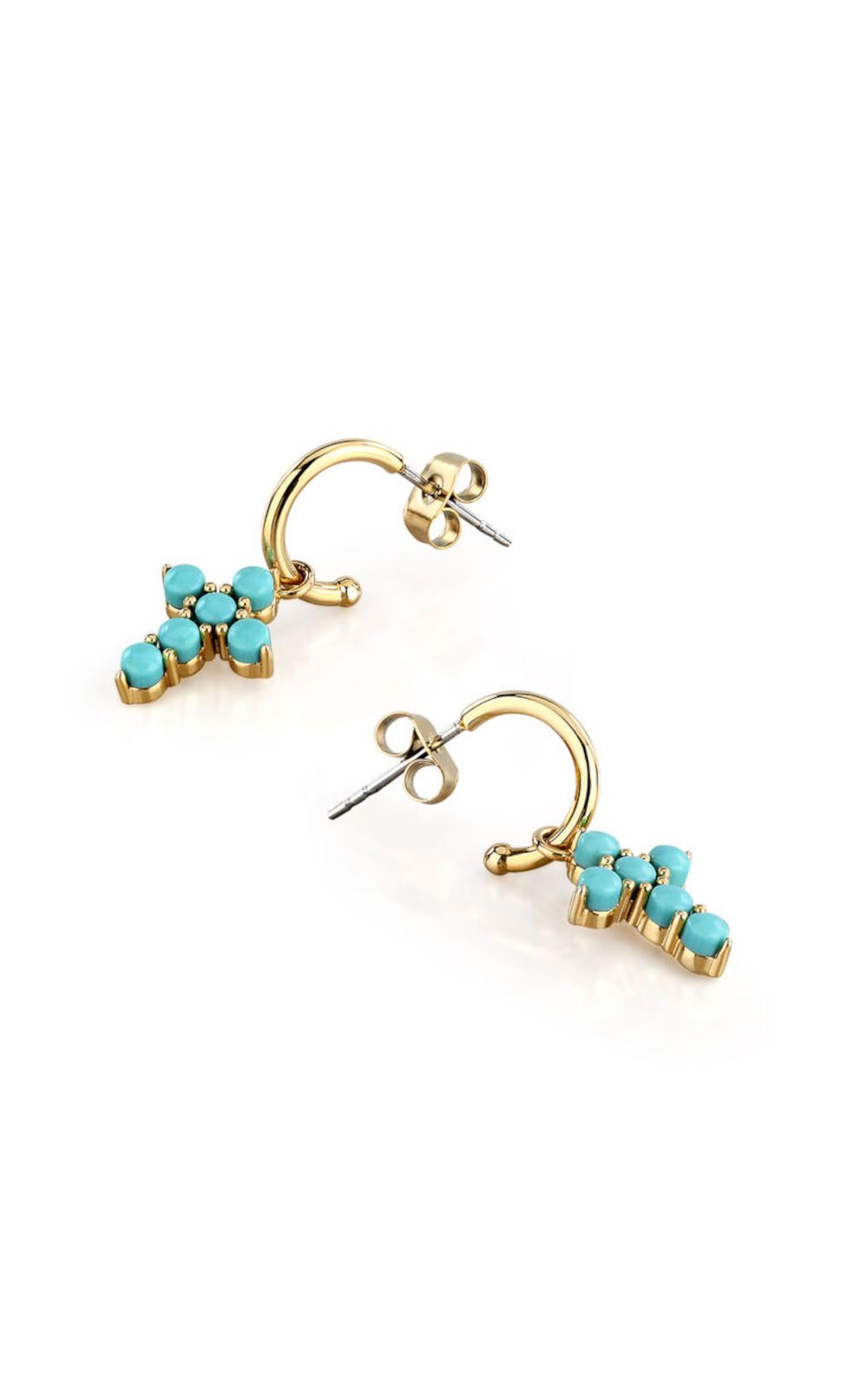 Γυναικεία σκουλαρίκια CHIARA FERRAGNI χρυσού χρώματος. Είναι κατασκευασμένα από ανοξείδωτο ατσάλι και διακοσμημένα με τιρκουάζ πέτρες(2,7cm).